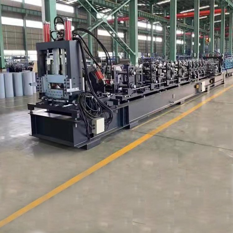 無極變速C型鋼機是一套軋輥可生產多種規格C型檁條成品的單卷成型機組。該機主要由被動裝料架,整平裝置,沖孔裝置,成型后切斷裝置,液壓站,電腦控制系統等。