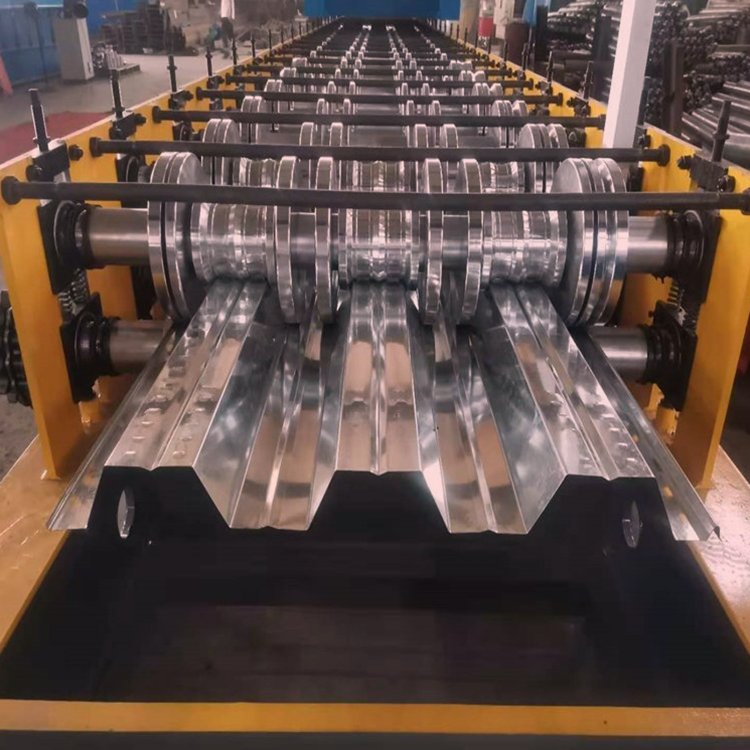 750樓承板機(鋼承板,建筑壓型鋼板)是采用鍍鋅鋼板經輥壓冷彎成型,其截面成V型、U型、梯形或類似這幾種形狀的波形,主要用作時間長性模板,也可被選為其他用途。